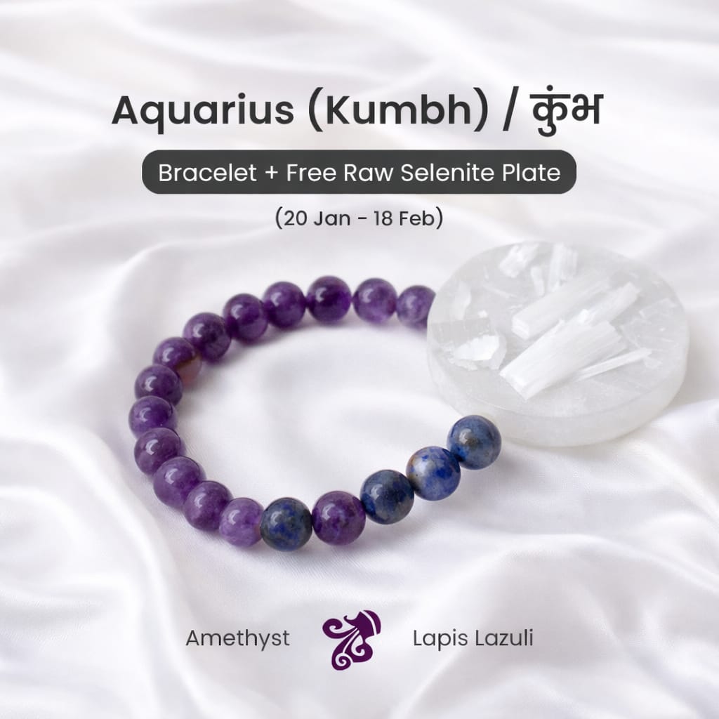 The Aquarius Amethyst Clear Quartz Bracelet is designed for people born under Kumbh Rashi (Aquarius). This bracelet combines the soothing energy of Amethyst with the powerful cleansing properties of Clear Quartz.