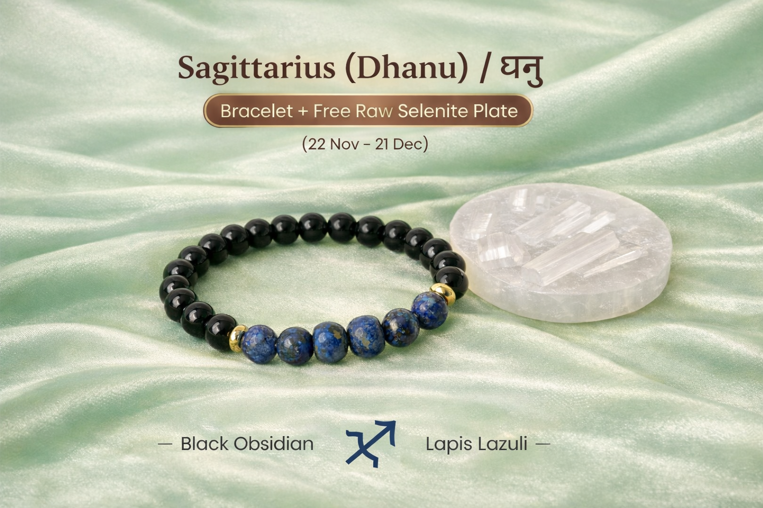 Sagittarius Black Obsidian Lapis Lazuli Bracelet is specially designed for Dhanu Rashi. Black Obsidian helps protect from negative energy, while Lapis Lazuli supports wisdom, clarity and communication. Ideal for daily wear.