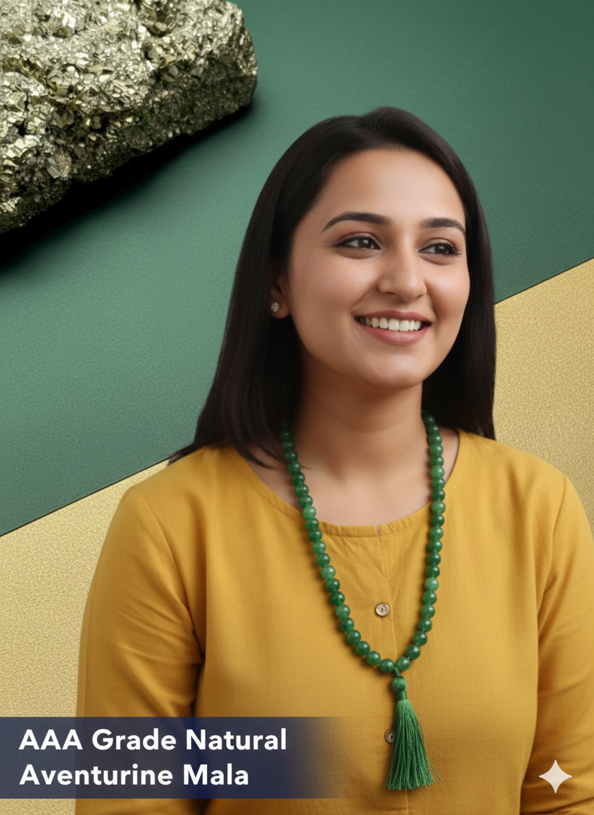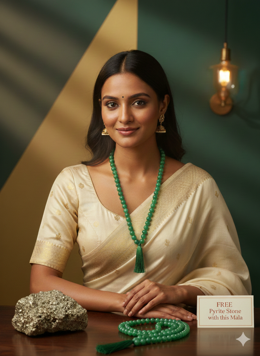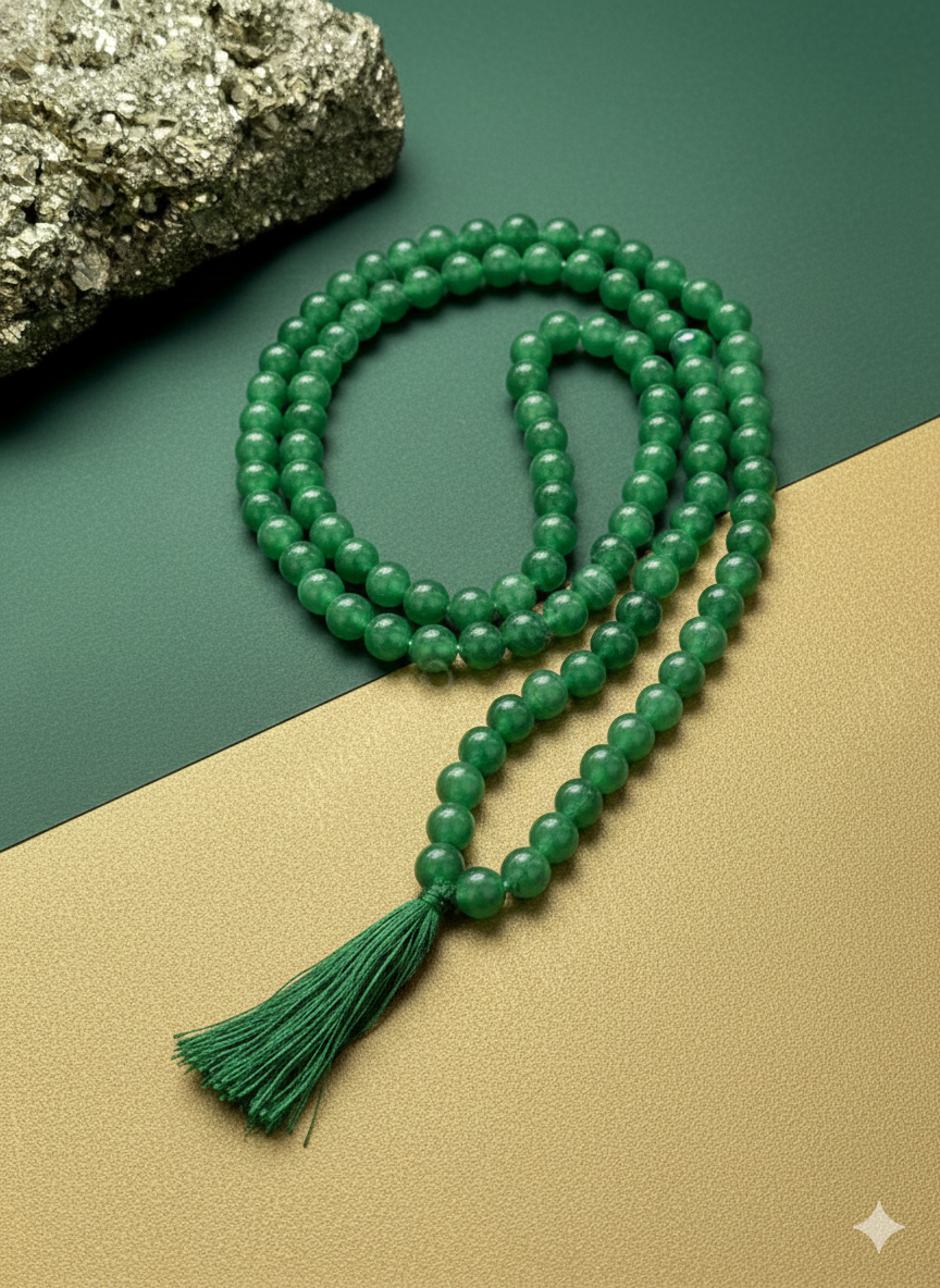 The Varad Mudra Green Aventurine Luck Mala is designed for those seeking good fortune, growth, and new opportunities in career, business, and personal life.