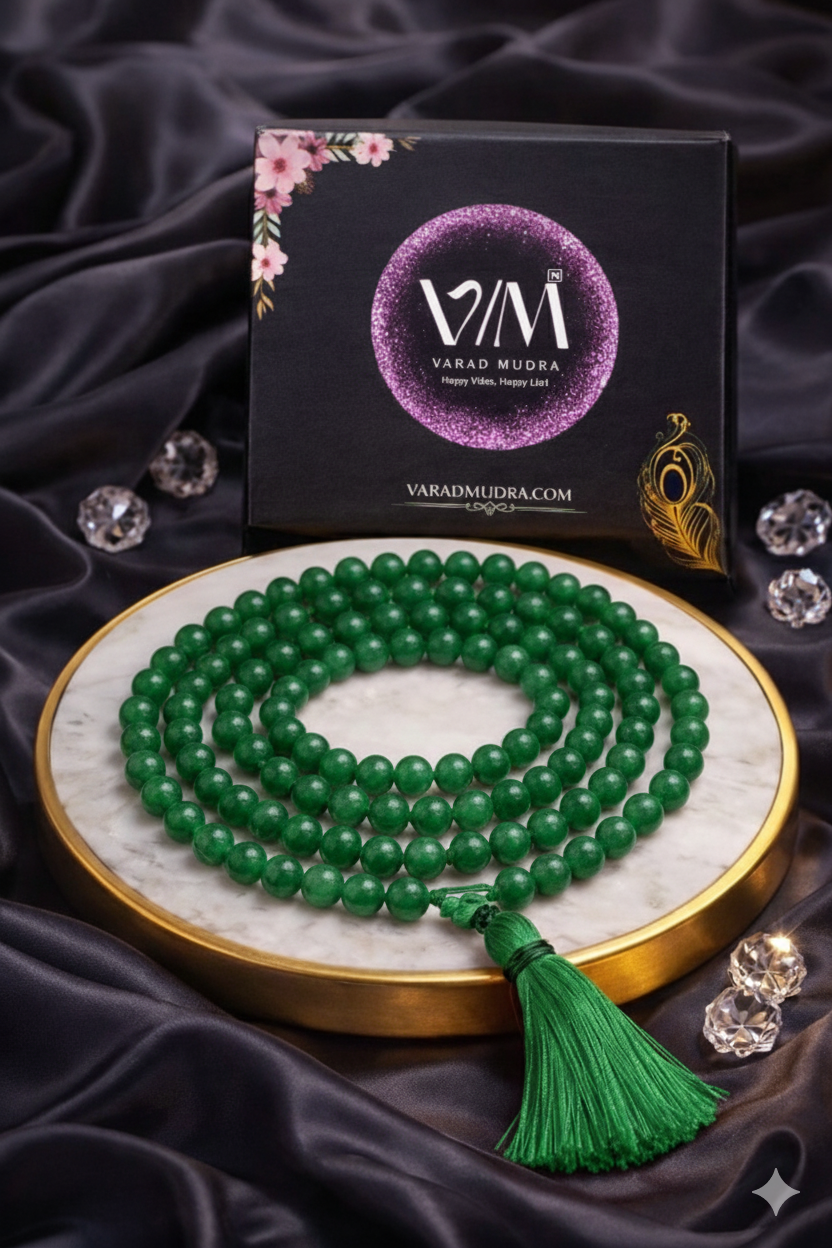 The Green Aventurine Mala from Varad Mudra is made with natural aventurine beads, often known as the stone of luck and opportunity.