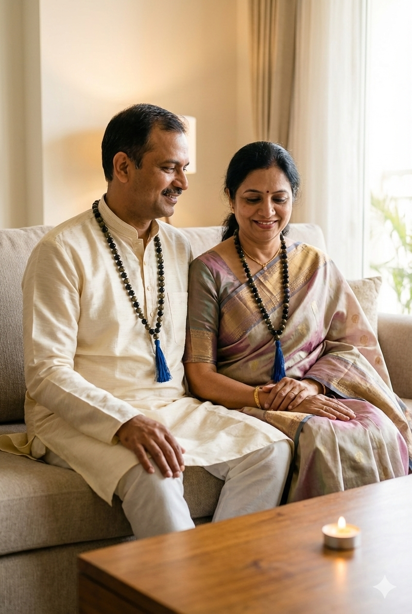 The Varad Mudra Pyrite & Black Obsidian Mala is a spiritually curated crystal mala designed for people seeking financial growth, protection, and energetic balance.