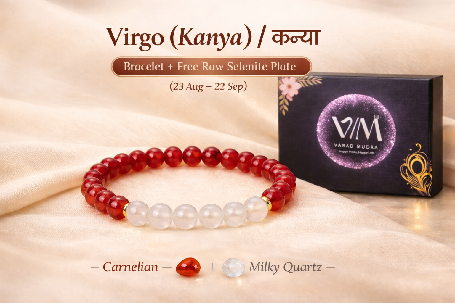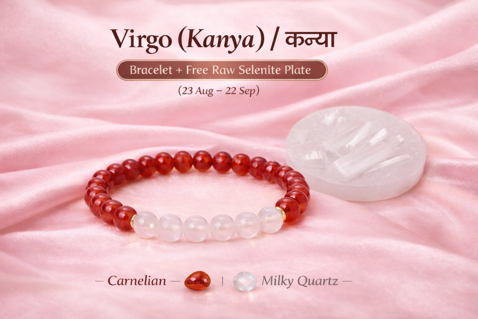 Virgo (Kanya) Rashi Bracelet – Carnelian & Milky Quartz Zodiac Crystal Bracelet with Free Selenite Plate